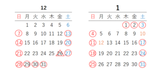 印の日が12月・1月の休業日です。
