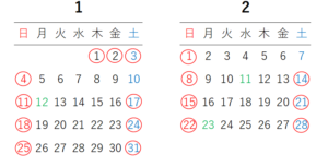 お知らせ news TOP > お知らせ > 🔶休業日のご案内🔶 🔶休業日のご案内🔶 平素はリサイクルプラントをご利用頂きありがとうございます。 〇印の日が1月・2月の休業日です。 1月10日・2月7日の土曜日は通常通り営業いたします。 1月12日・2月11日・2月23日の祝日は通常通り営業いたします。