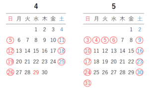 お知らせ news TOP > お知らせ > 🔶休業日のご案内🔶 🔶休業日のご案内🔶 平素はリサイクルプラントをご利用頂きありがとうございます。 〇印の日が4月・5月の休業日です。 4月29日の祝日は通常通り営業いたします。